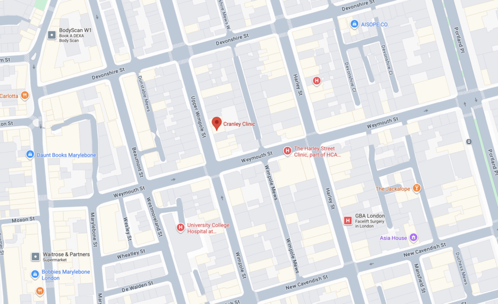 Cranley Clinic is located on the ground floor at 4 Upper Wimpole Street, London W1G 6LF, in the heart of Marylebone.